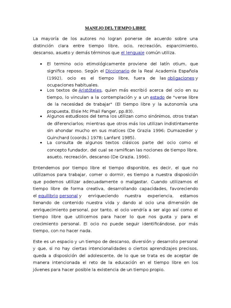 Tiempo libre y ocio autores. También en 1980 el español frederic munné 1989 quien en cierta medida adelantándose a su tiempo ya en 1971 había dedicado un capítulo al ocio en su libro grupos masas y sociedades publique su obra crítica psicosociología del tiempo libre en el que estudia de forma brillante las diferentes propuestas sobre el ocio que se han dado a lo largo de la historia y propone su particular teoría del tiempo libre. Cuando se habla de ocio y tiempo libre se suelen asociar dichos conceptos como si de sinónimos se tratasen sin embargo se debe tener en cuenta que aun existiendo una estrecha relación entre ambos conceptos se trata de concepciones diferentes. Distintos autores señalan que el ocio es un tiempo libre en el que decidimos realizar algo placentero eso que en inglés se.